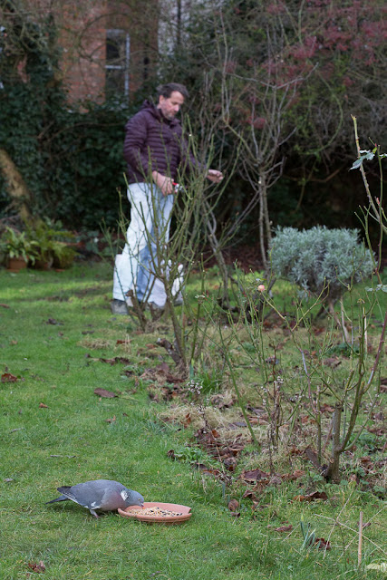 Percy Pigeon seems very comfortable chomping away while Dave fertilises the roses. Nice to see you have given Percy a plate to dine from. I guess that London pigeons are more cultured than Yorkshire pigeons. They probably expect plates while uncouth Yorkshire pigeons expect their food to be simply scattered on the grass.