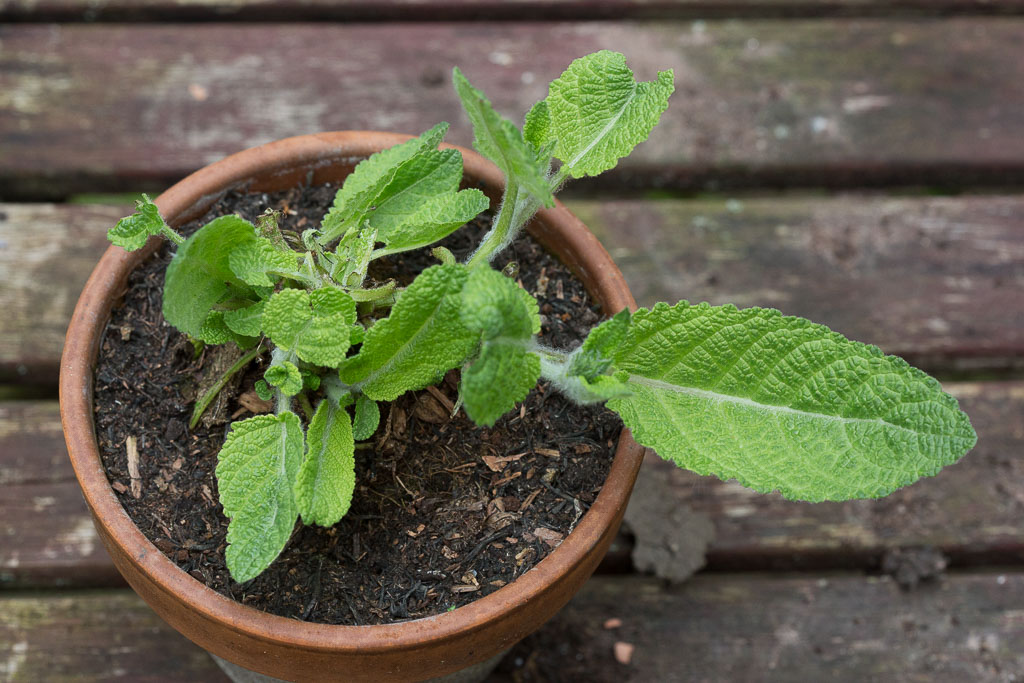 That sage that was gnawed nearly to death by slugs has re-emerged, now that it's in a pot on the patio table.