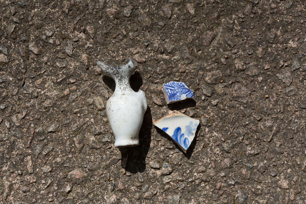 Here are some other little odds and ends -- a few pottery chips and something that looks like a tiny amphora or jug. I think it once had a handle, on the right, but that's now broken off. I wonder what the story is there? It's solid, whatever it is, so it's just for show.