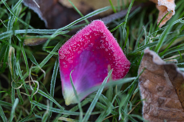 We did have a pretty hard frost the night before last. When I woke up yesterday morning, there was ice on the lawn (and on this fallen rose petal)...
