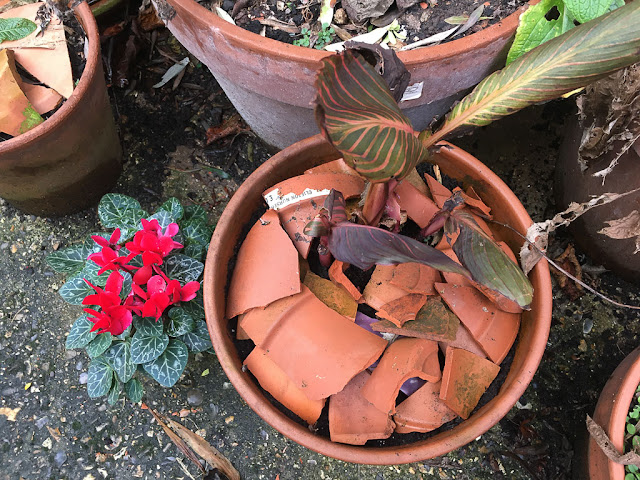 Here's the new cyclamen -- or "cyclurinamen," as Mitchell cleverly dubbed it yesterday -- on the left with the red flowers. And on the right is one of our canna lilies, which is looking a bit scorched by our earlier cold weather. I had to fill the pot with terra cotta shards because the freaking squirrels have recently insisted on trying to dig up the plant.